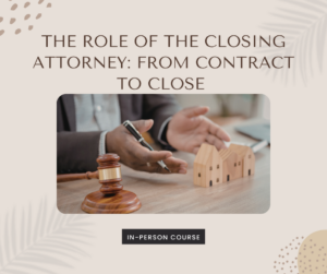 This course gives South Carolina real estate professionals a clear, practical overview of how closing attorneys facilitate a transaction. The class covers the key parties involved, common documents used, and how title, escrow, and closing funds are handled from contract to closing day. This course is ideal for new agents or experienced agents who want a helpful refresher on the attorney’s role and how their work fits into the overall closing process.