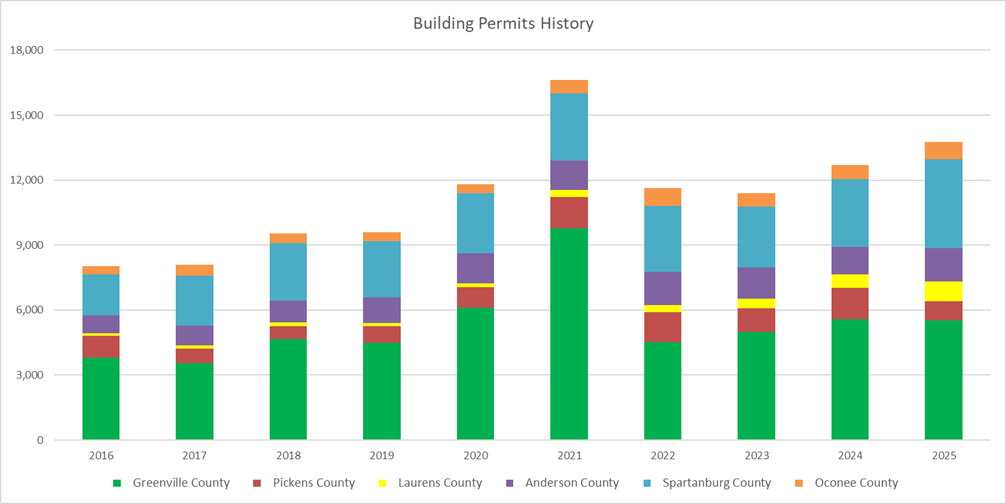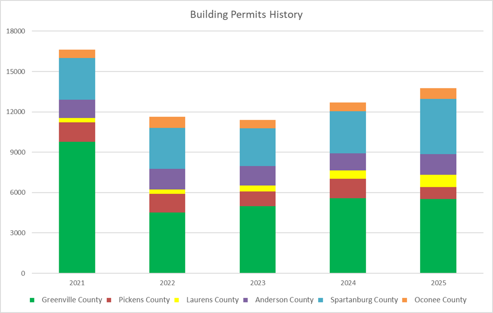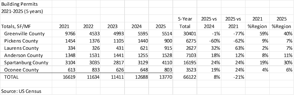 I combined single-family and multi-family building permits because together they constitute housing units that can be occupied by families. However, only Greenville County has a meaningful number of multifamily housing permits. In 2025, about 20% of Greenville County’s permits are multifamily, and almost 99% of the multifamily permits in the region.
