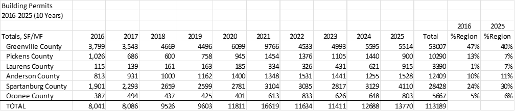 And Pickens County tells the tale of the impact of lengthy moratoriums. After a year-long moratorium in the county, and an 18-month moratorium in Easley, homebuilding fell 62%. But those permits just moved to other counties. Overall, homebuilding was up 8% in the region in 2025.