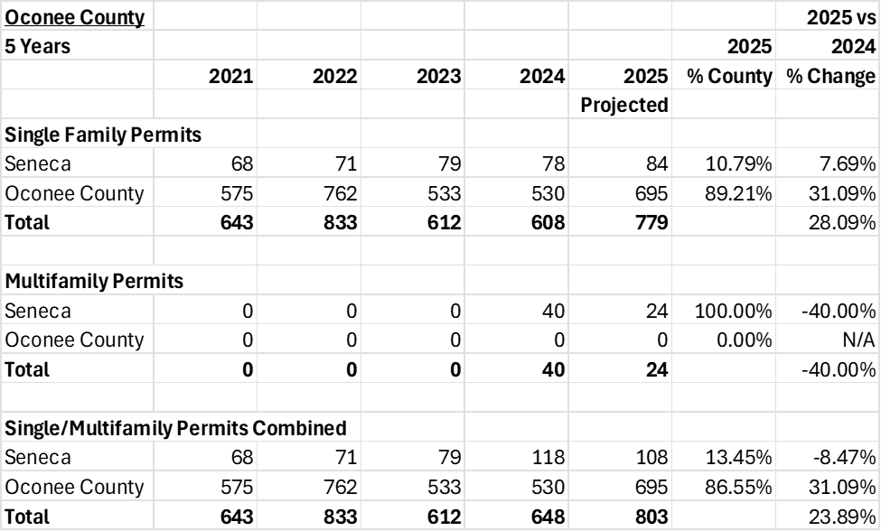 Unfortunately, Oconee County only breaks out Seneca and the unincorporated area. Seneca issues just 10% of the building permits in the county.